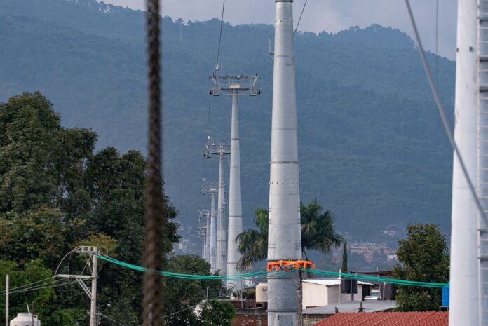 Uruapan, Michoacán, 24 de septiembre de 2025.– La construcción del teleférico de Uruapan continúa con la instalación y empalme del cableado por el cual circularán las 91 cabinas de este nuevo medio de transporte aéreo, cuyo avance es del 87 por ciento, informó la secretaria de Desarrollo Urbano y Movilidad, Gladyz Butanda Macías.