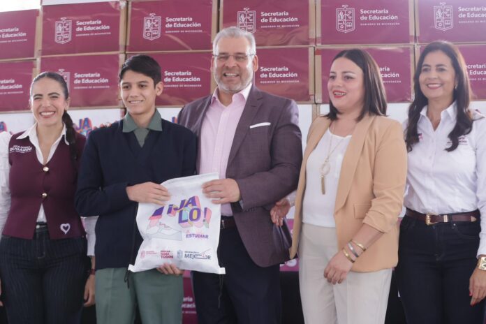 Morelia, Michoacán, 12 de septiembre de 2025.- Como parte del Programa Jalo a Estudiar, Jalo por la Paz, el gobernador Alfredo Ramírez Bedolla inició la entrega tenis de alta calidad para cerca de 40 mil estudiantes de escuelas secundarias de Morelia, a quienes invitó a permanecer en las aulas para convertirse en hombres y mujeres de bien.