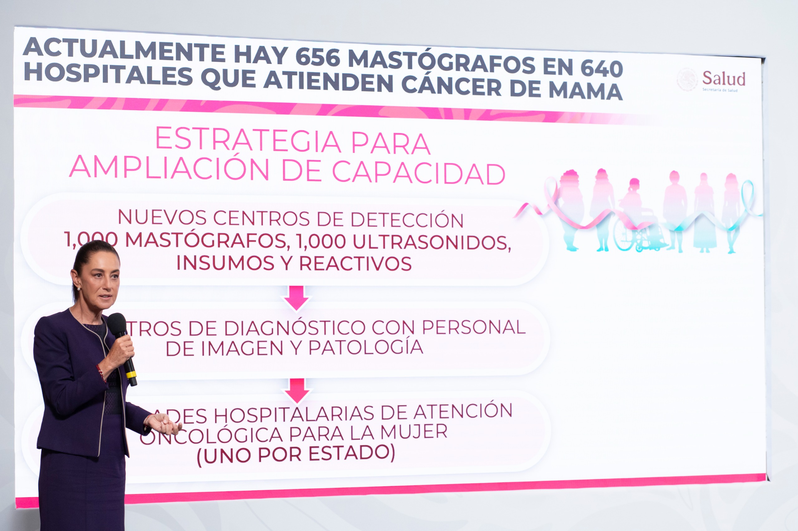 El plan incluye la adquisición de mil mastógrafos y mil ultrasonidos entre 2026 y 2027 —que se sumarán a los 656 equipos actualmente en operación en 640 hospitales del país—, además de la creación de 20 nuevos Centros de Diagnóstico y la construcción de 32 Unidades Hospitalarias de Atención Oncológica para la Mujer, una en cada estado.