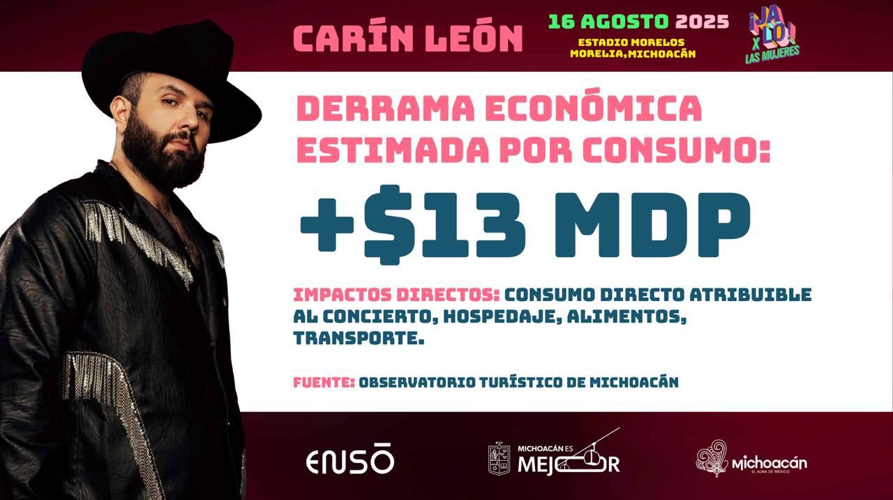 Morelia, Michoacán, 11 de agosto de 2025.- El concierto de Carín León dejará una derrama económica superior a los 13 millones de pesos entre hospedaje, consumo de alimentos y transporte para la capital michoacana, así lo señaló el gobernador Alfredo Ramírez Bedolla.