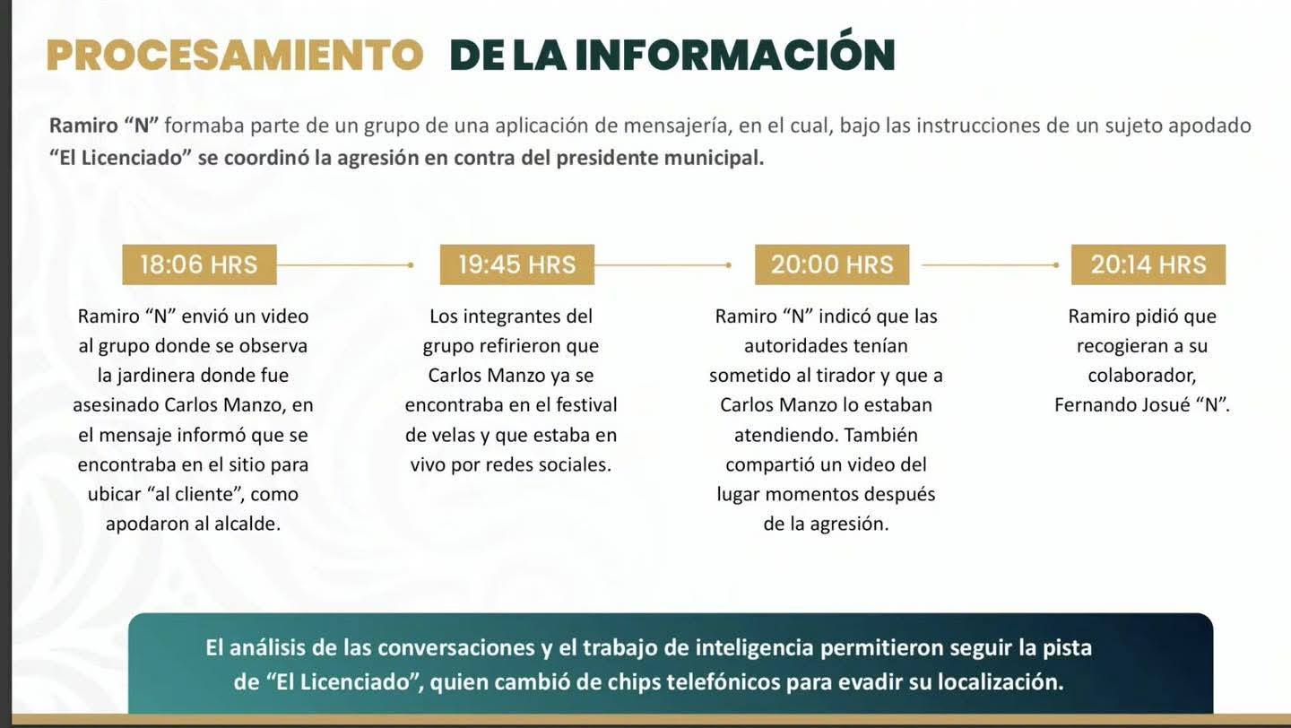 El análisis de un teléfono celular asegurado reveló que Jorge Armando “N” impartió instrucciones directas al menor y a los otros dos agresores, ordenándoles disparar aun cuando Carlos Manzo estaba acompañado, e indicando “ultimar al edil”.