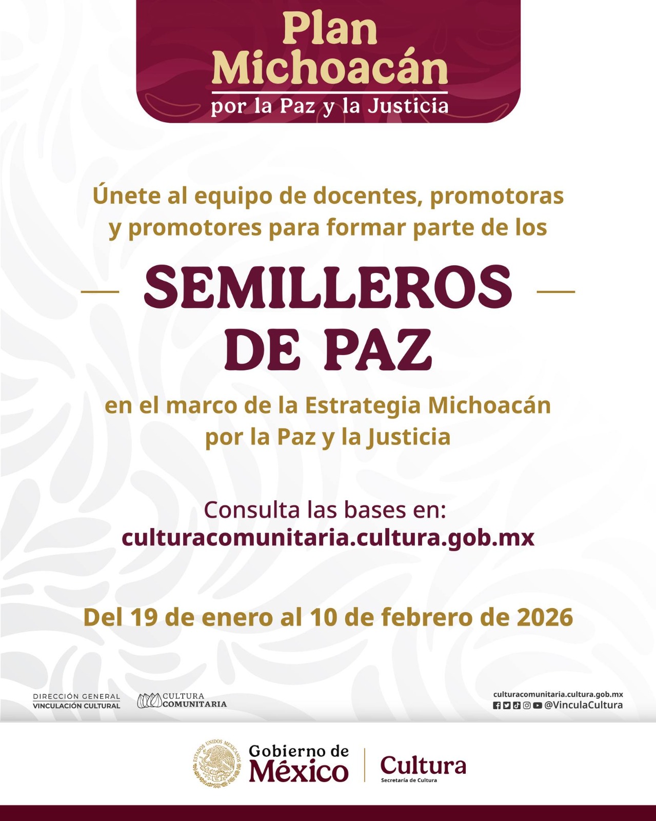 Morelia, Michoacán, 26 de enero de 2026.- En el marco del Plan Michoacán por la Paz y la Justicia, la Secretaría de Cultura de Michoacán (Secum), en coordinación con su homóloga federal, convocan a docentes artísticos, promotoras y promotores culturales a participar en la conformación de hasta 20 Semilleros de Paz que operarán en diversos municipios del estado.
