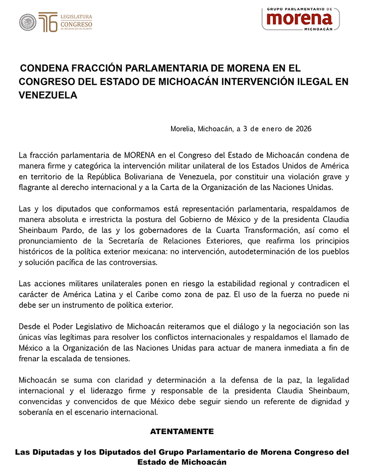 Finalmente, el GP de Morena afirmó que Michoacán se suma con claridad y determinación a la defensa de la paz, la legalidad internacional y al liderazgo firme y responsable de la presidenta Claudia Sheinbaum, con el objetivo de que México continúe siendo un referente de dignidad en el ámbito internacional.