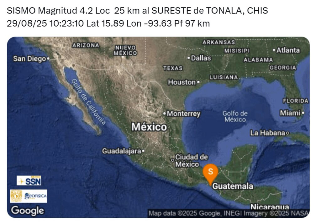 Tonalá, Chiapas, 29 de agosto de 2025. — El Servicio Sismológico Nacional (SSN) informó que este viernes, en punto de las 10:23 horas, se registró un sismo de magnitud 4.2 con epicentro a 25 kilómetros al sureste de Tonalá, Chiapas.