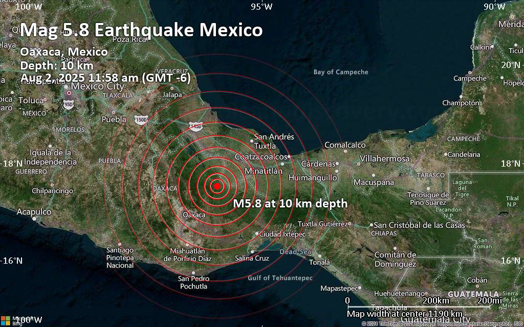 2 de agosto de 2025.- Un sismo de magnitud 5.9 se registró la mañana de este sábado 2 de agosto a las 11:58 horas, con epicentro a 13 kilómetros al noreste del municipio de Tlacolula, Oaxaca, informó el Servicio Sismológico Nacional (SSN). Inicialmente se reportó como un movimiento de magnitud 5.6, pero minutos más tarde fue ajustado oficialmente a 5.9.